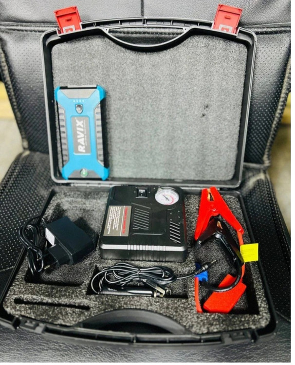- سایر ویژگی ها: قابلیت استارت خودرو قابلیت تنظیم باد لاستیک (کمپرسور )و پنچرگیری قابلیت پاور بانک ظرفیت باتری 20000mAH/5V ابعداد کیف ۳5×۲8×۸ سانتیمتر قابلیت استارت باتری خودرو مناسب جهت راه اندازی وسایل الکترونیک خودرو مناسب برای شارژ همزمان موبایل، تبلت و … راه اندازی باتری ماشین دارای چراغ قوه LED و دو عدد چراغ فلشر اضطراری آبی و قرمز خروجی USB دارای چراغ و قطب نما