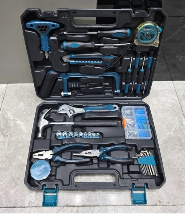 آچار فرانسه سایز ۸، انبردست، دمباریک، چراغ قوه LED، چکش با میخ کش، مجموعه هشت عددی آچار آلن، کاتر سایز بزرگ روکش دار، بکس تک سایز ۴ تا ۱۳، متر ۳ متری روکش دار، پیچ گوشتی دوسو و چهارسو سایز بزرگ، چهار عدد پیچ گوشتی سایز ریز دو سو و چهار سو، دسته پیچ گوشتی T نوک خوربکسی، ۹ عدد نوک پیچ گوشتی، تبدیل نوک پیچ گوشتی به بکس چسب برق، فازمتر دیجیتال، دو سایز پیچ گوشتی موبایلی دو سو و دو سایز پیچ گوشتی موبایلی چهارسو، کمان اره چوب و فلز، مجموعه سایزبندی پیچ و رولپلاک